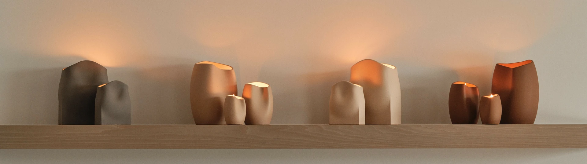 Voor de vormgeving van de kaarsenhouders van Fumaci liet Pauline zich inspireren door de grillige schoonheid van de natuur. Geen strak minimalisme, maar pure, organische vormen, warme, natuurlijke tinten en een zachte textuur.