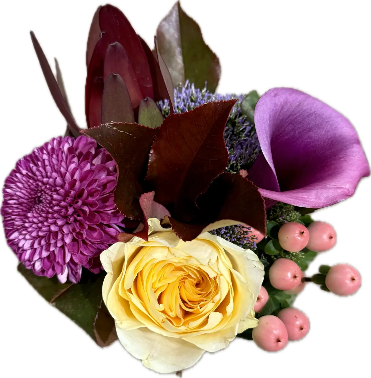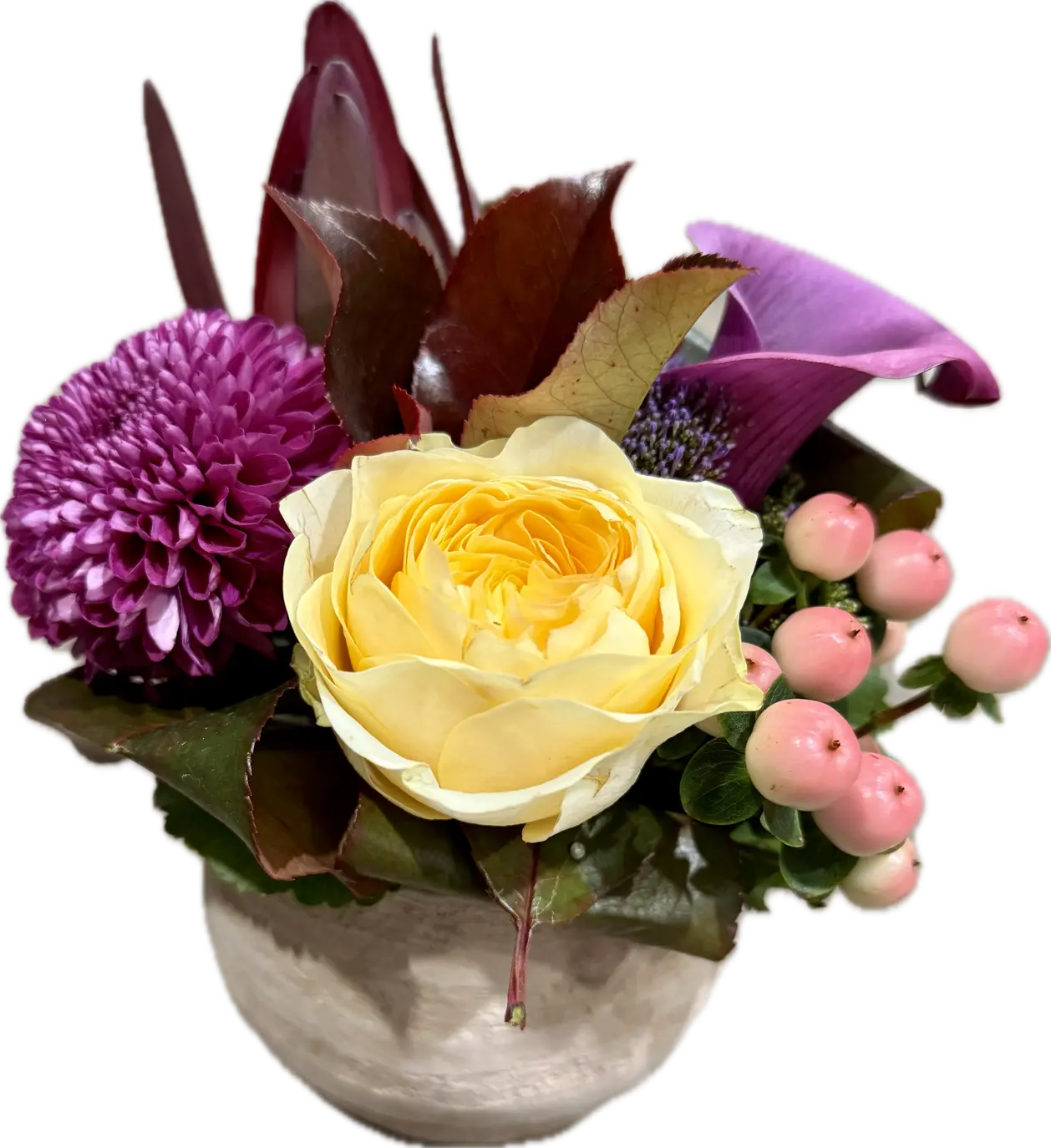 La composition florale moderne Auriel est un arrangement élégant et compact, présenté dans un pot beige. Elle comprend une rose jaune pâle, un chrysanthème pompon violet, une calla violette, hypericum rose et un leucadendron rouge, créant un ensemble coloré et harmonieux.