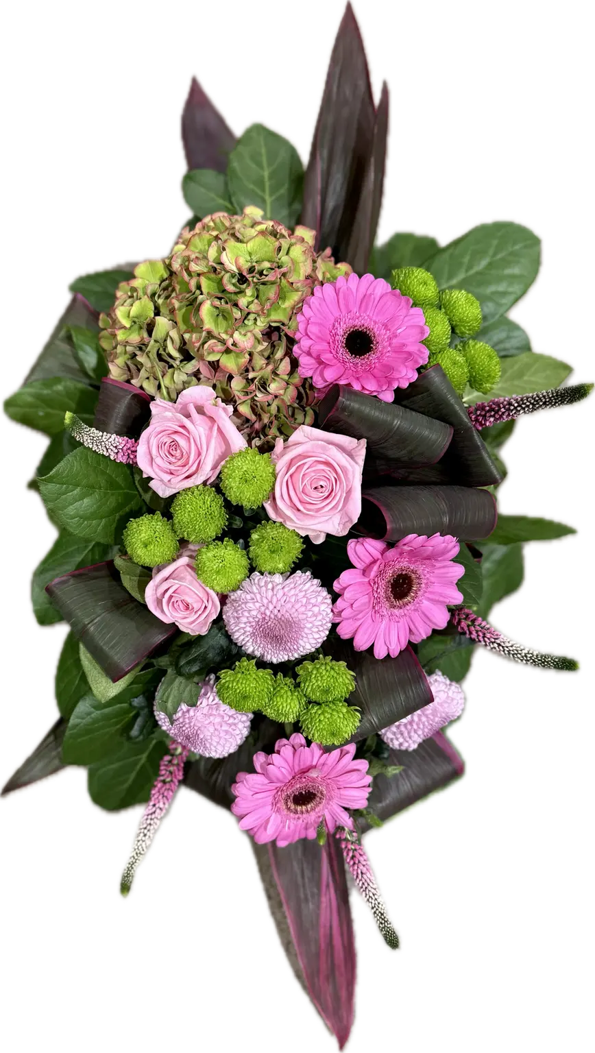 La composition florale moderne Embrace combine couleurs et textures dans un arrangement élégant et contemporain. Elle contient des chrysanthèmes pomponets roses, roses et gerberas roses, hortensia vert aux bords rouges, veronica rose, santini vert, le tout fini avec cordyline pourpre aux bords roses, pour un ensemble harmonieux et raffiné.