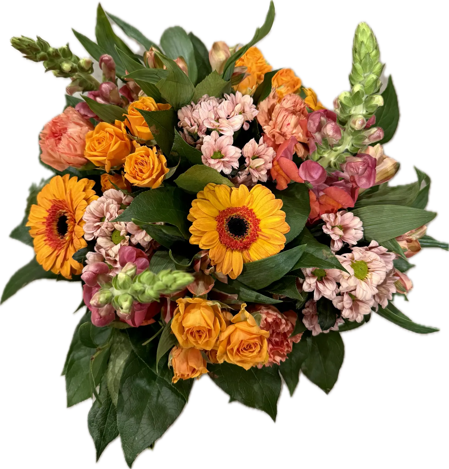 Les œillets orange ajoutent du volume et de la texture, tandis que les mufliers aux teintes orange et rosées apportent une touche de douceur et un bel équilibre.