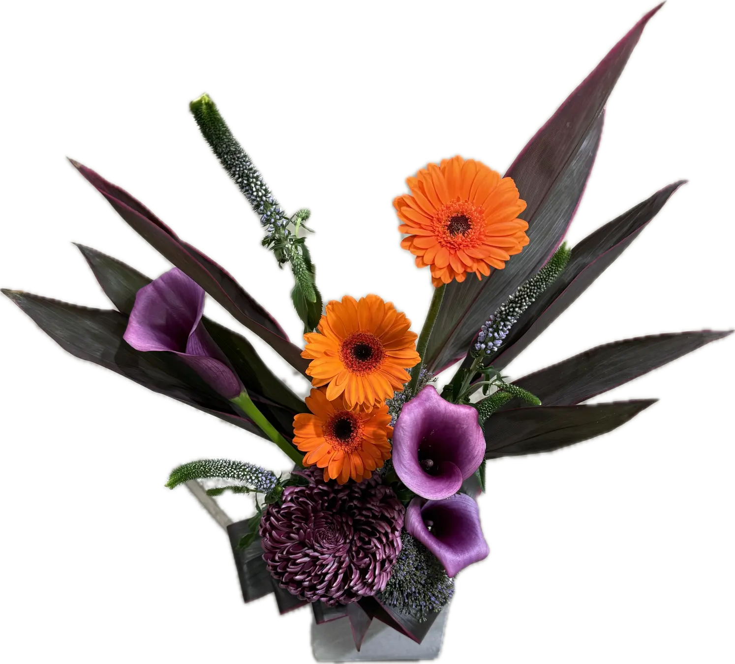 De combinatie van paarse calla, paarse chrysant, oranje gerbera, paars cordylineblad met roze randen, lichtpaarse veronica en paarse trachelium zorgt voor een harmonieus spel van warme en koele tinten. De krachtige vormen en moderne kleuren geven Halo een serene maar opvallende uitstraling — een prachtig eerbetoon aan wie je met liefde wilt herdenken.