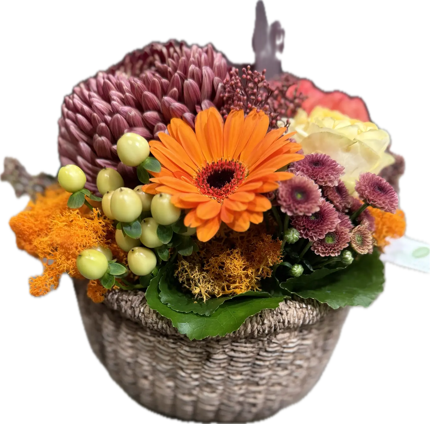 Het moderne bloemstuk Eclipse combineert een natuurlijke uitstraling met een kleurrijk en harmonieus design. Geplaatst in een stenen potje dat de indruk van een gevlochten mandje geeft, bevat dit arrangement rode chrysant, oranje gerbera, lichtgele roos, hypericum, oranje anjer, bordeaux santini, rode leucadendron en rode skimmia.