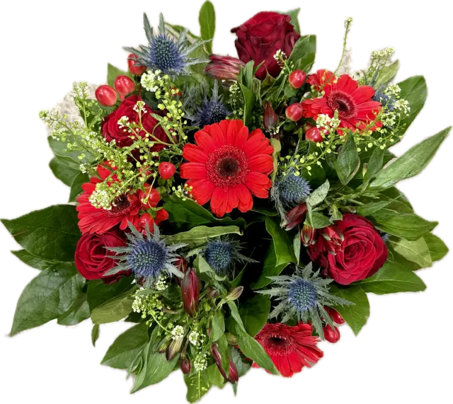Laat je betoveren door Ever After, een intens en romantisch boeket dat passie en elegantie samenbrengt. De combinatie van dieprode rozen, gerbera en alstroemeria straalt liefde en warmte uit, terwijl de rode hypericum een subtiele sprankeling toevoegt. Het tlaspi en de blauwe eryngium geven het geheel een verrassend contrast en een unieke, harmonieuze uitstraling.