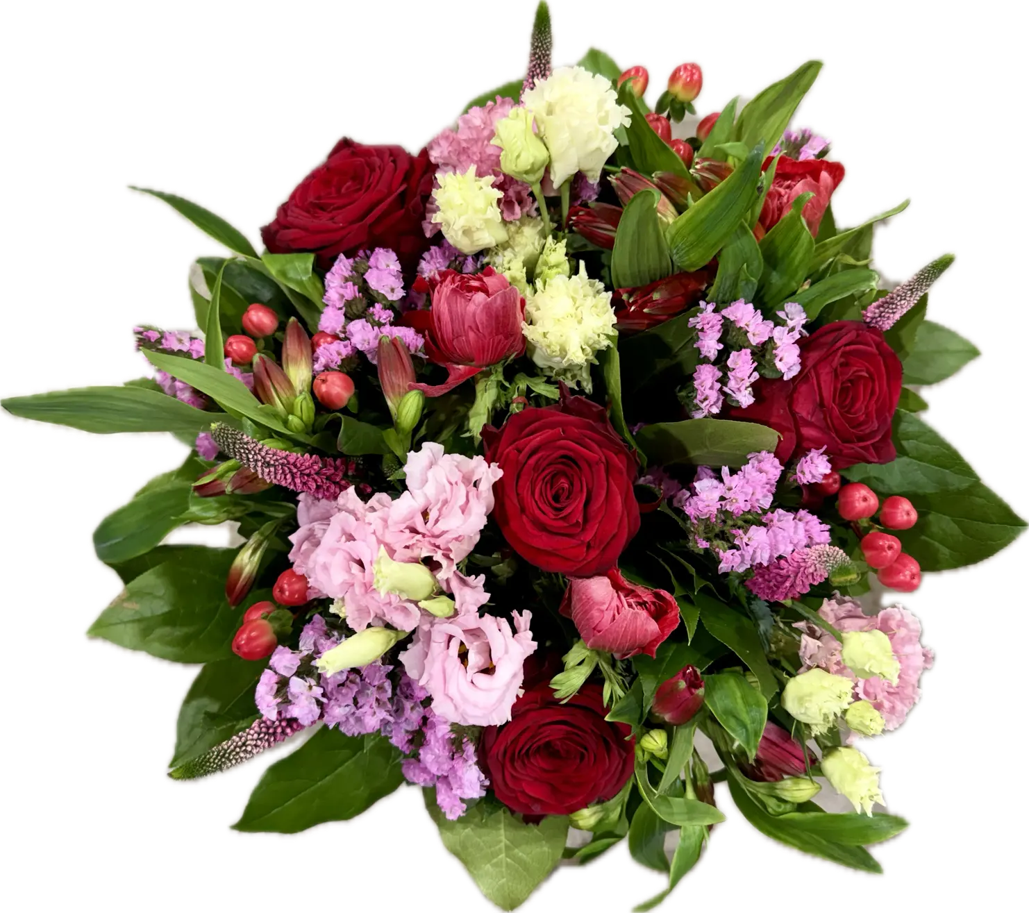 Lichtpaarse limonium en roze veronica geven het boeket een luchtige, verfijnde toets en zorgen voor een harmonieuze overgang tussen passie en tederheid. Forever Yours straalt elegantie en emotie uit — een boeket dat liefde viert die blijft, vandaag en altijd.