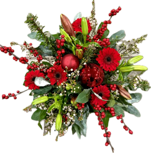 Vier de feestdagen in stijl met Merry Berries, een feestelijk boeket dat winterse gezelligheid en kleur combineert. Stralende witte en rode lelies en vrolijke rode gerbera’s vormen het hart van dit arrangement, terwijl ilex takken met besjes, kerstgroen en glanzende kerstballen het geheel een magische, feestelijke touch geven. Witte waxflower en eucalyptus robusta zorgen voor een frisse, natuurlijke afwerking en een elegante textuur.
