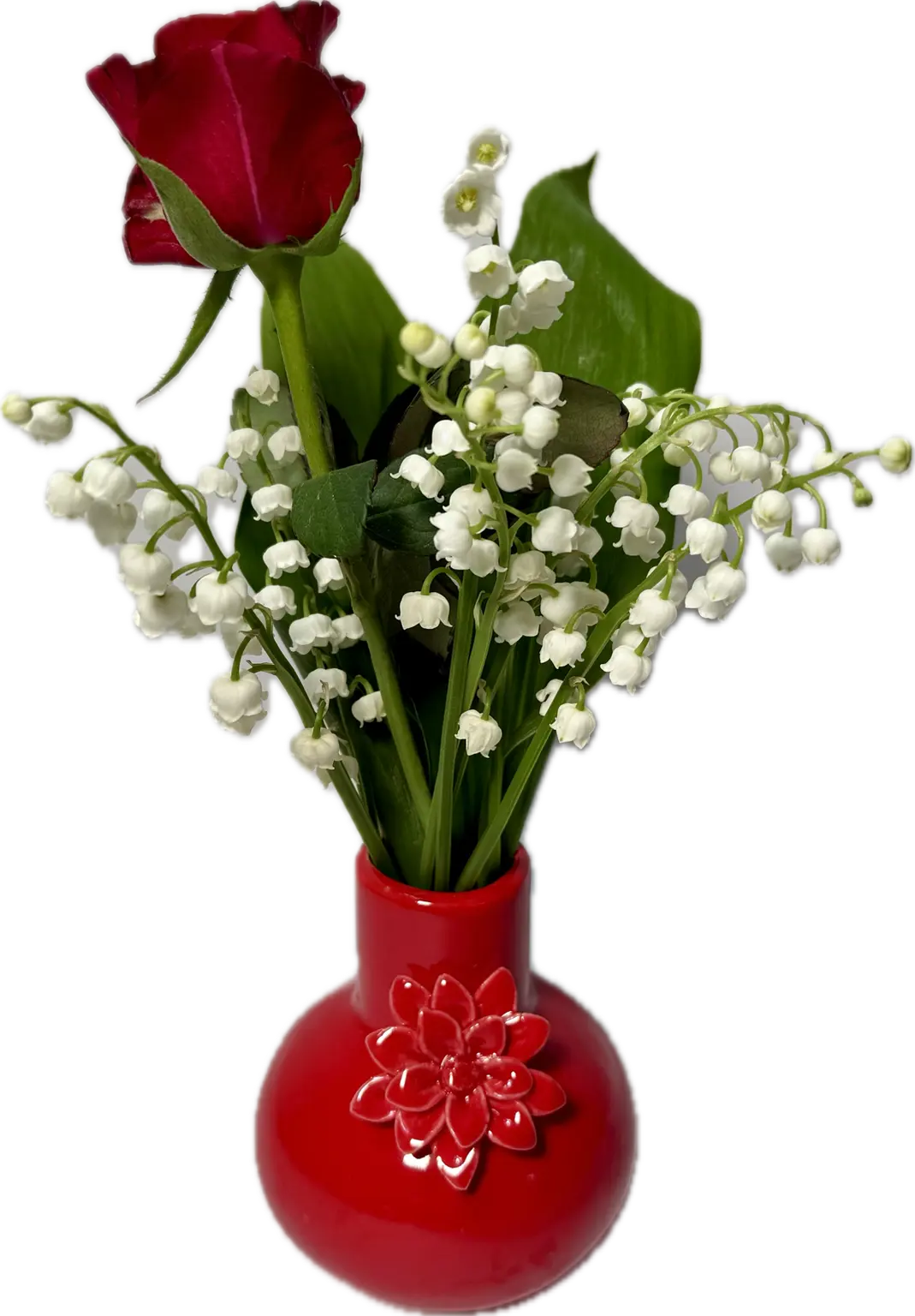 Dit stijlvolle rode keramieken vaasje, gevuld met fijne meiklokjes en een bijpassend rood roosje, is een prachtig en betekenisvol cadeautje. Ideaal om iemand op 1 mei te verrassen met iets bijzonders.